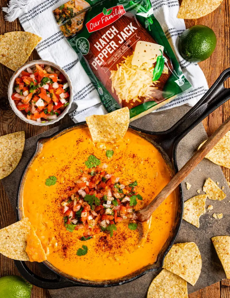Packed with peppers and corn, this queso dip is beyond delicious! It’s the perfect balance of spicy and creamy. Try it with Our Family Tortilla Chips today!