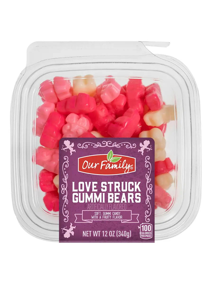 Our Family Love Struck Gummi Bears mixed with Cherry Gummi Hearts make for a tasty valentine for classmates and friends. A bag of conversation hearts are perfect for sharing with someone special!