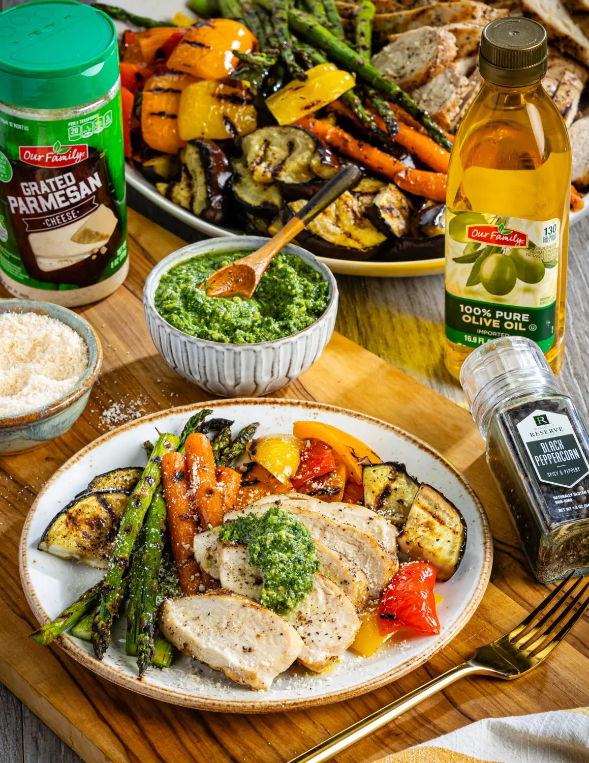 Grilled Chicken & Vegetables with Carrot Top Pesto is the perfect spring inspired dinner to enjoy as the warmer weather makes its way in! Kick off grilling season with this flavorful, healthy dinner the whole family will enjoy!