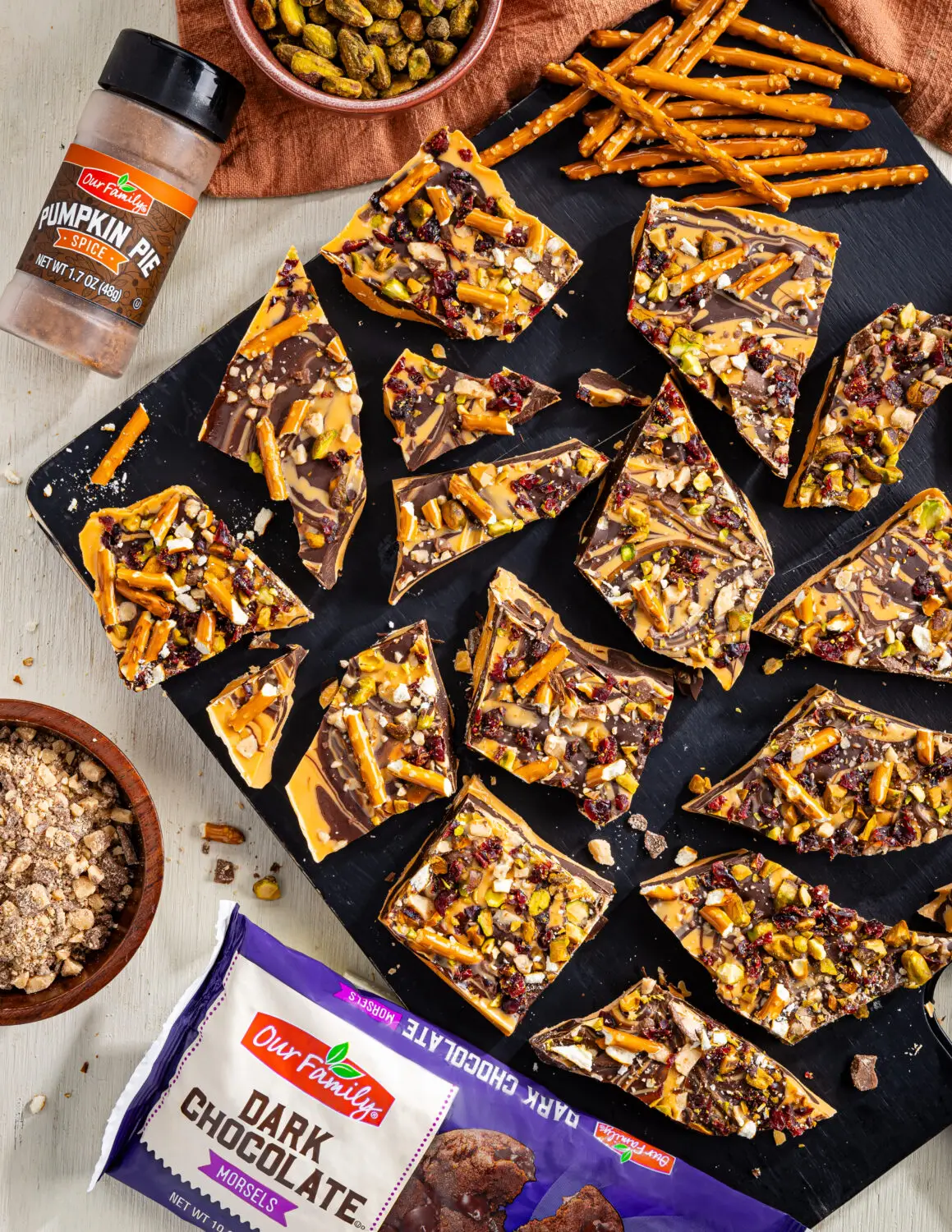 In medium microwave-safe bowl, heat remaining 1 cup butterscotch morsels in microwave oven on high 1 minute or until melted, stirring every 20 seconds; stir in remaining 1/2 tablespoon oil. Spread butterscotch mixture over chocolate mixture; with tip of small spatula, gently swirl butterscotch mixture into chocolate mixture to create marbled effect. Sprinkle butterscotch mixture with cherries, pretzels, pistachios and toffee bits; cover dish with plastic wrap and refrigerate 2 hours or until firm.