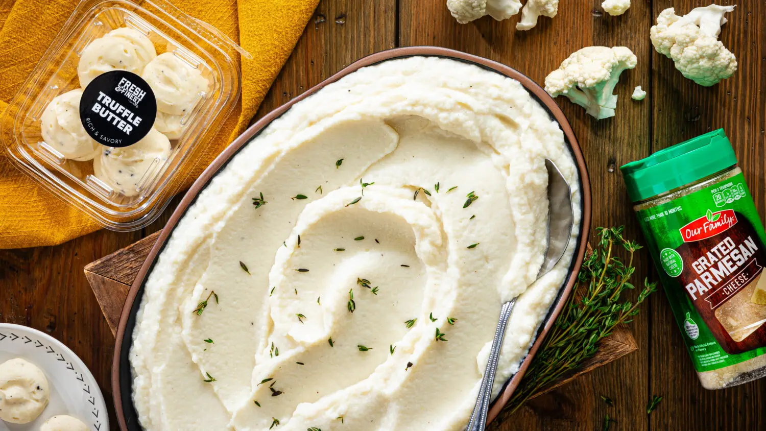 Add butter, cheese, salt and reserved 1/4 cup cooking water to food processor with cauliflower; purée 1 minute or until smooth. Makes about 4 cups.